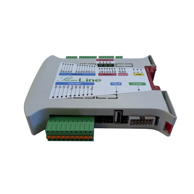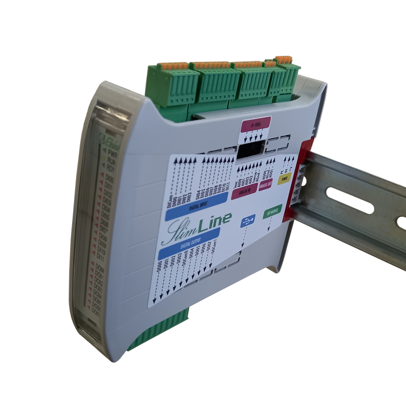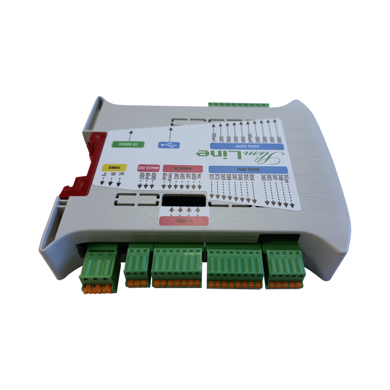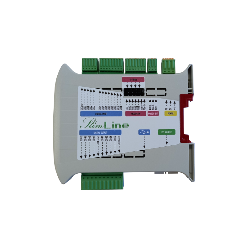 Esso dispone di 12 ingressi digitali optoisolati (PNP/NPN), 8 uscite digitali (Relé o SSR Zero-cross), 4 ingressi analogici 16bit configurabili, 2 uscite analogiche 0-10V e di una porta USB-A.